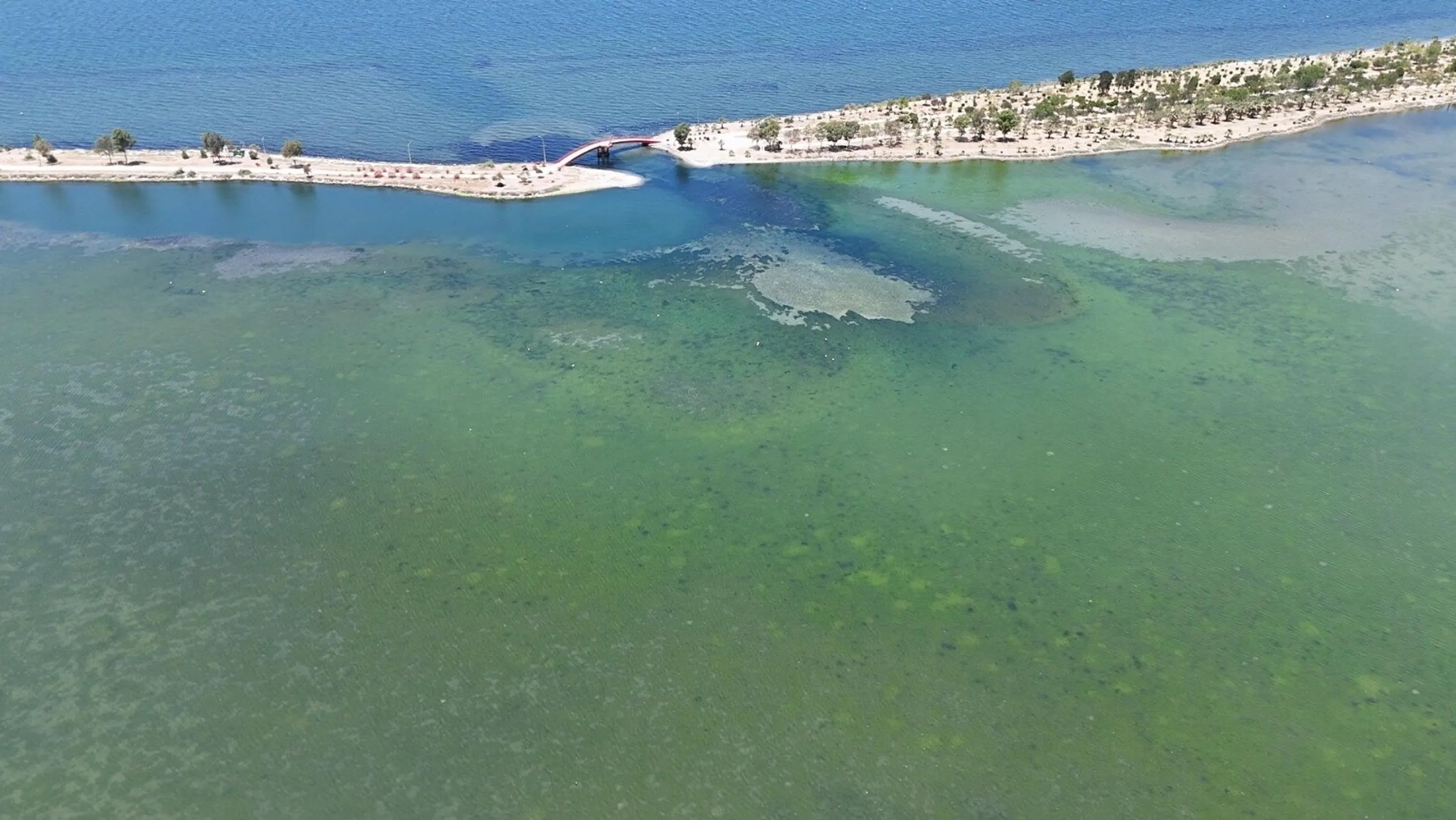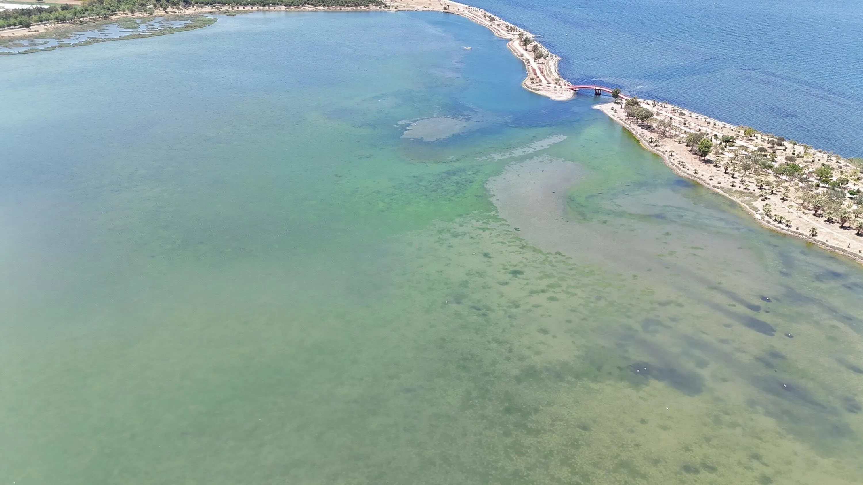 İzmir'in Balçova ilçesindeki Çakalburnu Lagünü'nün bazı bölümleri, havaların ısınmasıyla birlikte deniz yosunlarıyla kaplandı.